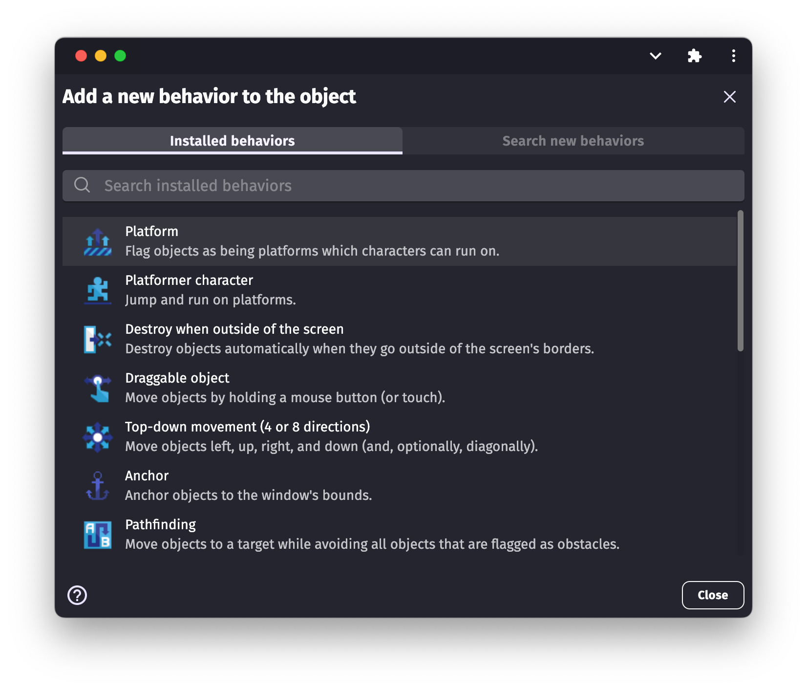 By selecting the "Platformer character" behavior, you can turn an object into a "Platformer character".