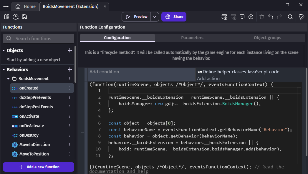• JavaScript should be only used for code independent from GDevelop