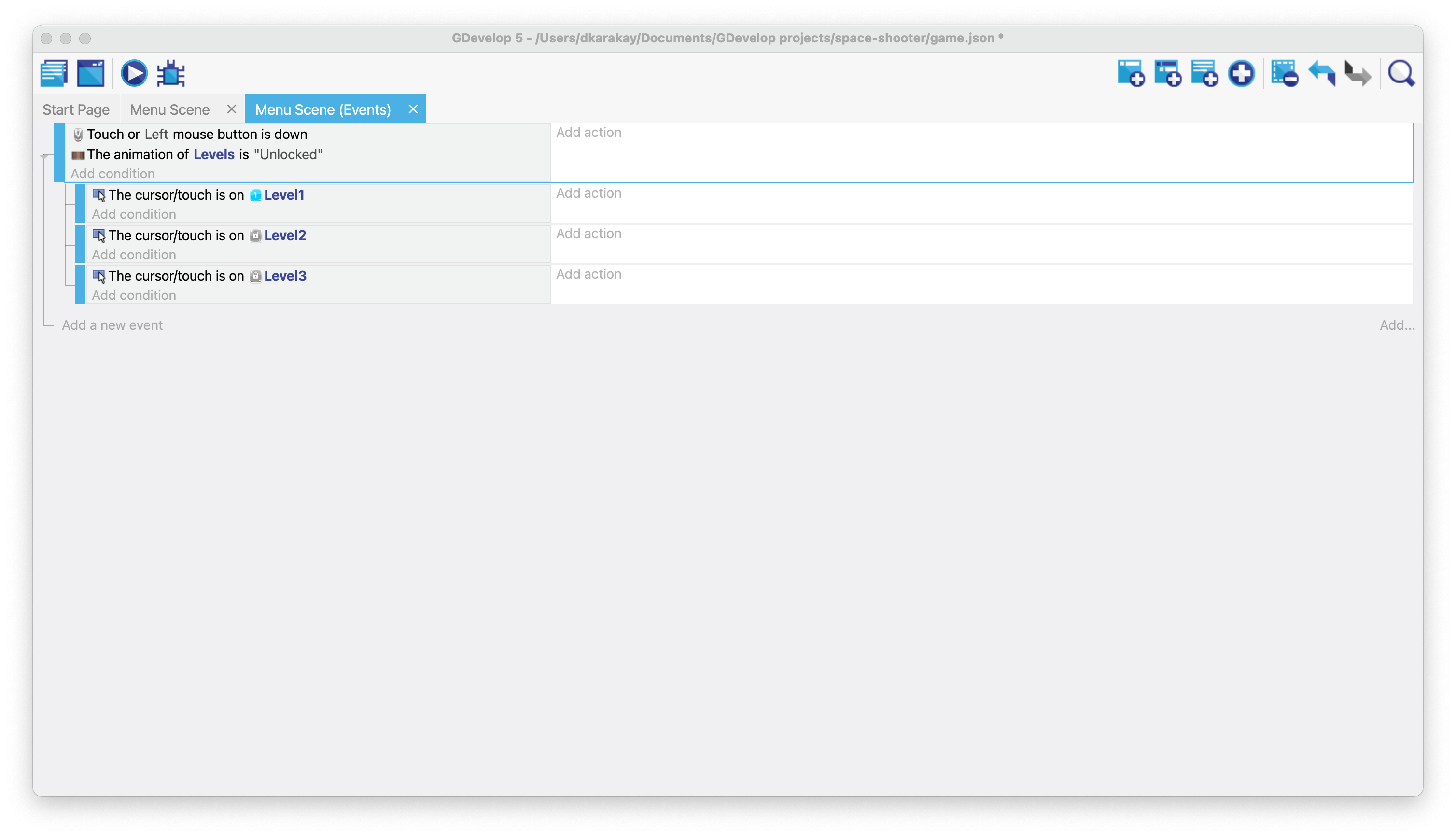 Create a new global variable called "LevelSelection" and set its initial value to 1. Then, change this variable to open the specific level (e.g., change it to 2 to load Level 2). Then add an action to run Base Scene. In the end, your events should look like this: