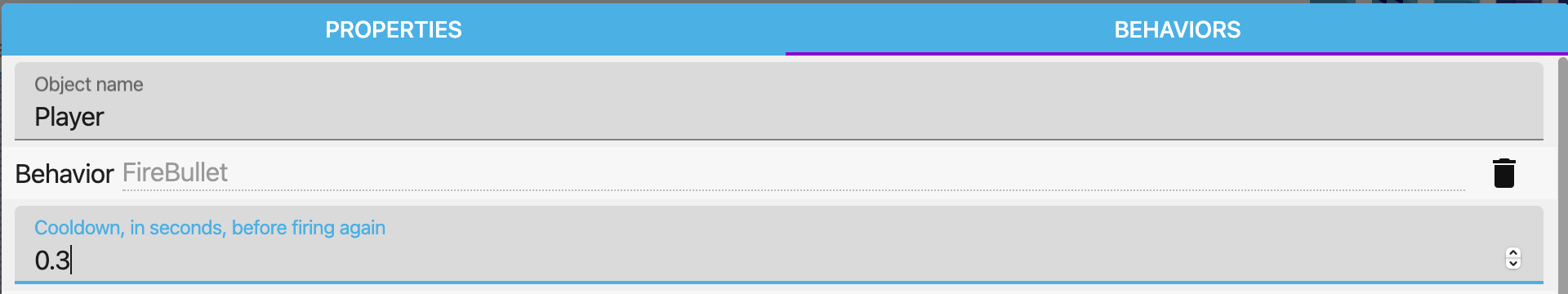 On the player's edit view, click on Add a new behavior to the object and search "fire" on Installed Behaviors. Then, select Fire Bullets. We'll now be able to fire bullets using an action that we'll add in the next steps.