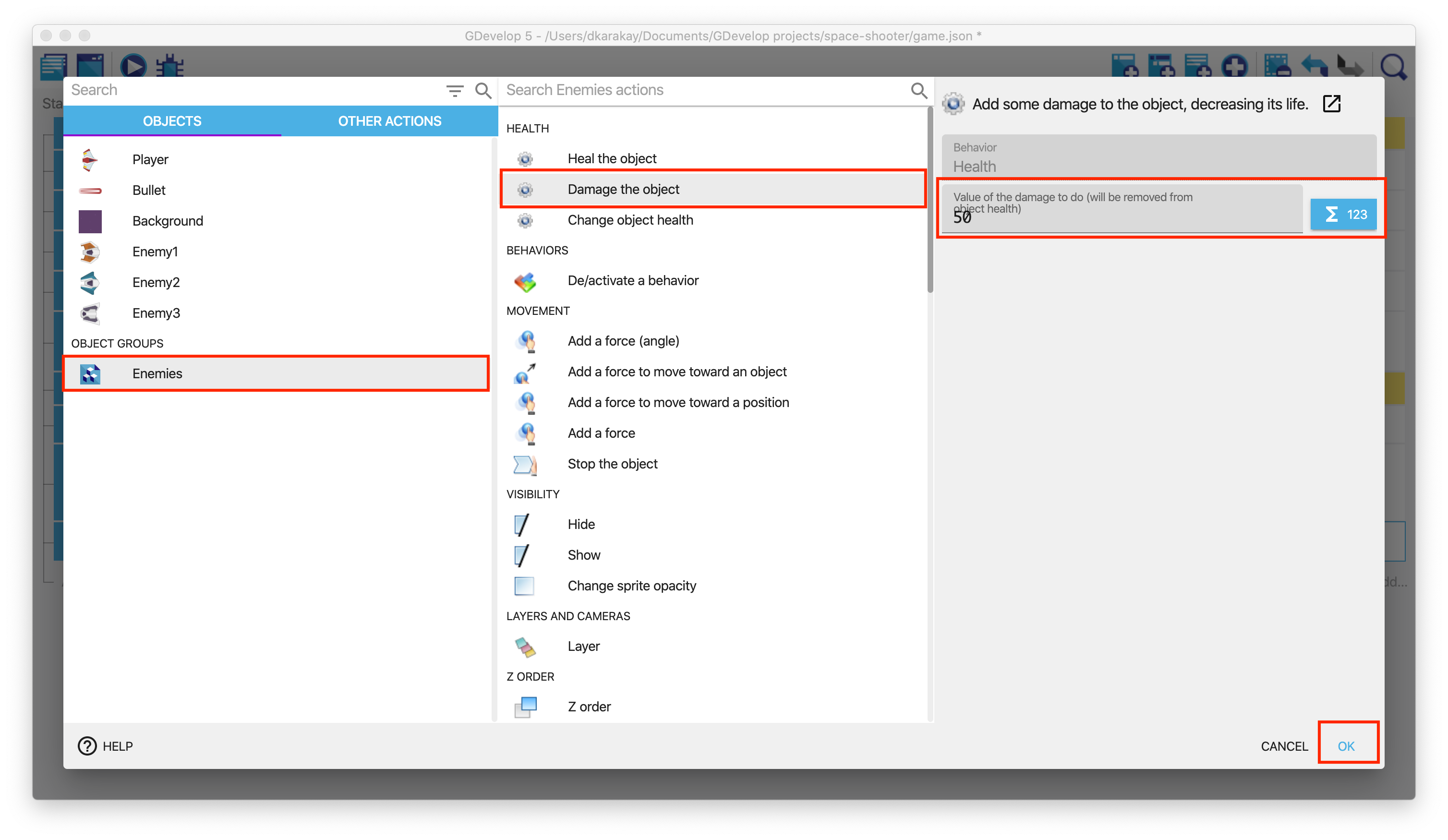 Now, we need to give damage to the Enemies. Choose Enemies and select Damage the object. Then, enter 50 for the value of the damage.