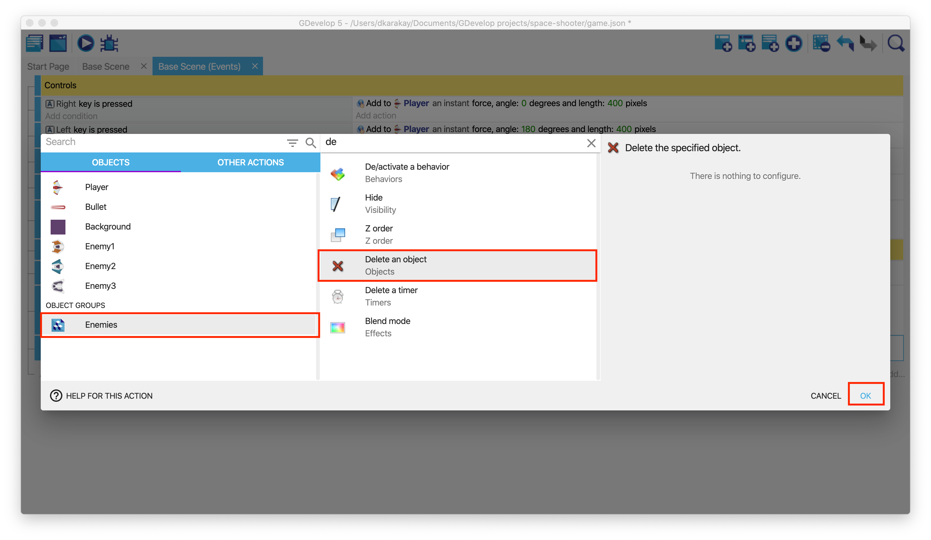 If the enemy is dead, we should delete the scene's object. We will add a new action to delete the object, just like in the previous steps.