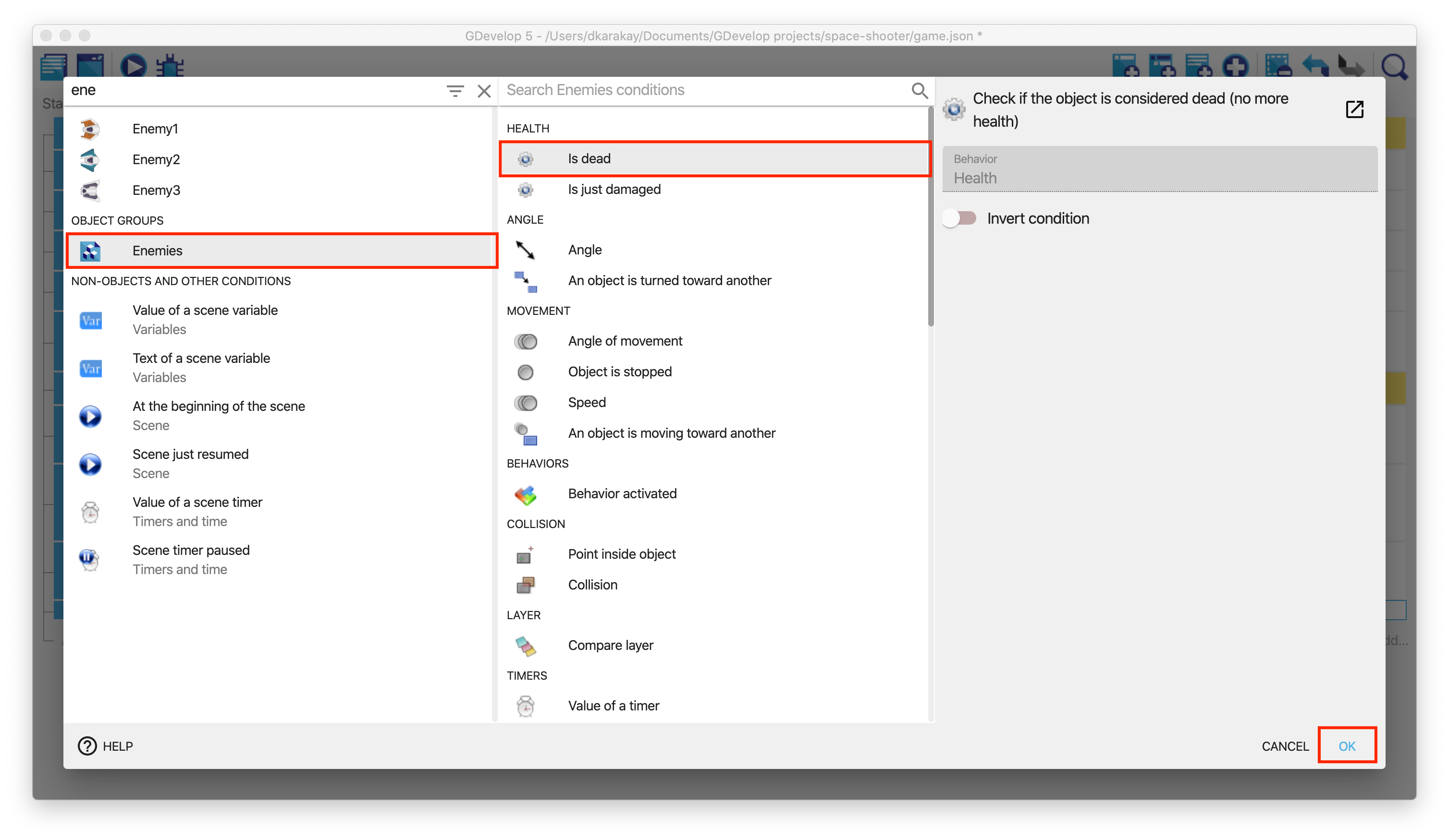 Then, we need to add an extra condition to determine whether the enemy is dead or not. We will add a new event under the last one. Select Enemies as objects and choose Is dead. Now we can track if the health of the enemy is dead or not.