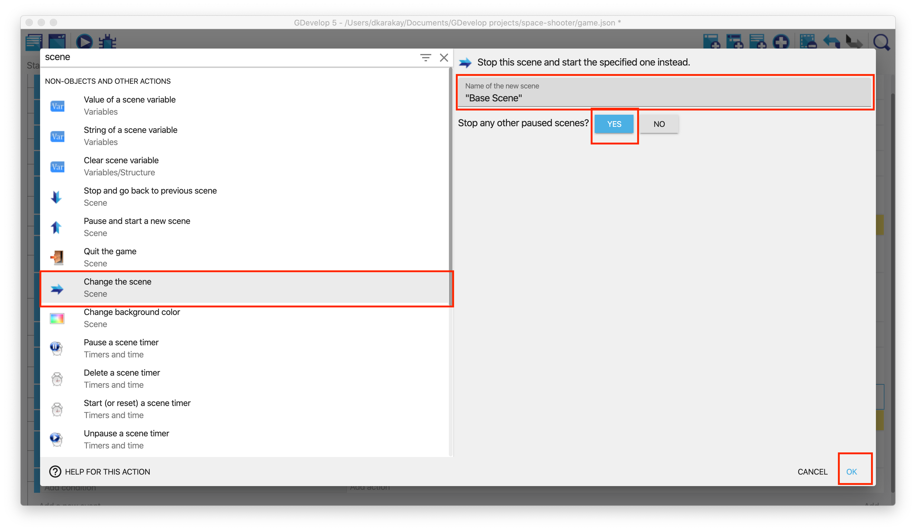 Our game is over when the player is dead. Add a new condition to check the player is dead or not. Then, add an action to restart the game. Type ** "scene" ** on the search bar and select Change the scene. Just select the "Base Scene" or your scene's name.